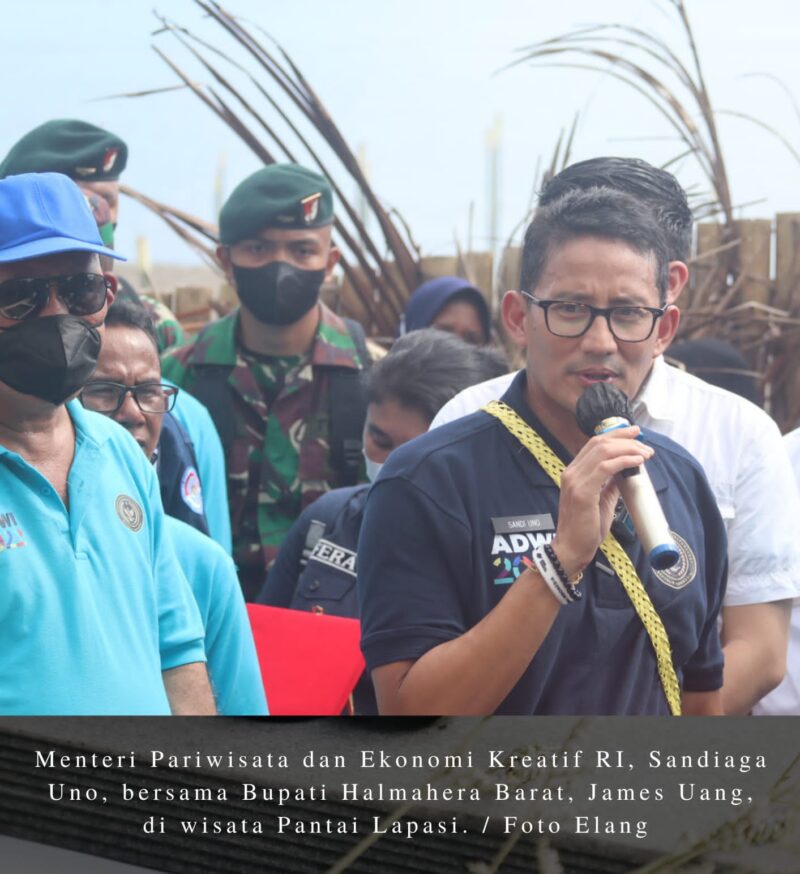 SALOIPOST.ID, Jailolo – Menteri Pariwisata dan Ekonomi Kreatif (Menparekraf) Sandiaga Salahudin Uno mengakui daya tarik destinasi wisata Pantai Lapasi yang terletak di desa Lako Akelamo, Kecamatan Jailolo, Kabupaten Halmahera Barat (Halbar). Diantara objek yang memicu daya tarik tersebut adalah indahnya hamparan pasir dan jejeran pohon kelapa.
