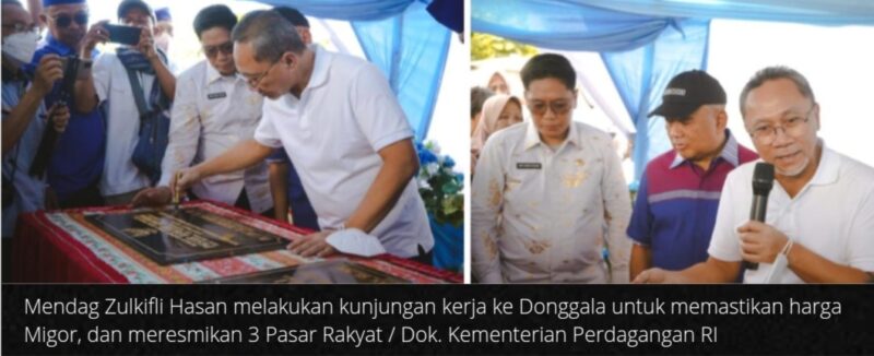 Dalam kunjungan kerja tersebut, Mendag Zulhas juga meresmikan tiga pasar rakyat yang berada di Kabupaten Donggala, yakni Pasar Labean, Pasar Ogoamas, dan Pasar Sioyong. Peresmian pasar secara praktis di Pasar Toaya, tempat Mendag Zulhas meninjau distribusi Migor curah serta harga dan pasokan barang-barang kebutuhan pokok (bapok).