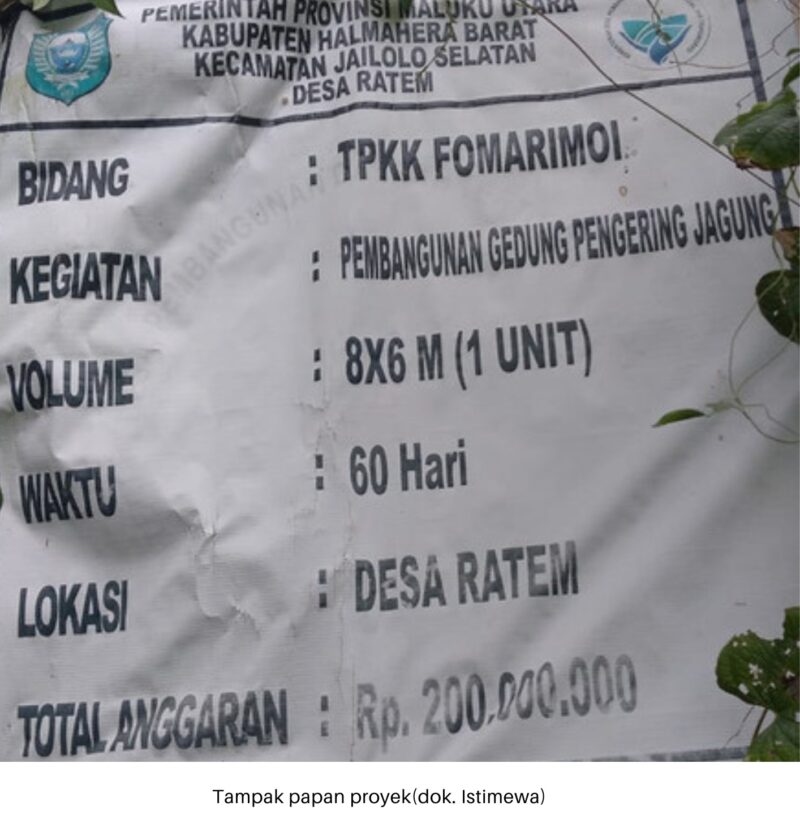 Dari total anggaran miliaran rupiah tersebut, diperuntukan untuk bangunan dan mesin pengering jagung. Namun yang terealiasi hanya bangunannya saja. Proyek tersebut dikerjakan secara swakelola oleh desa setempat.